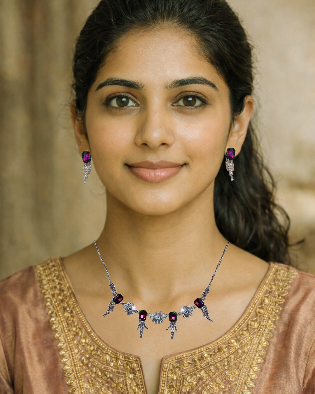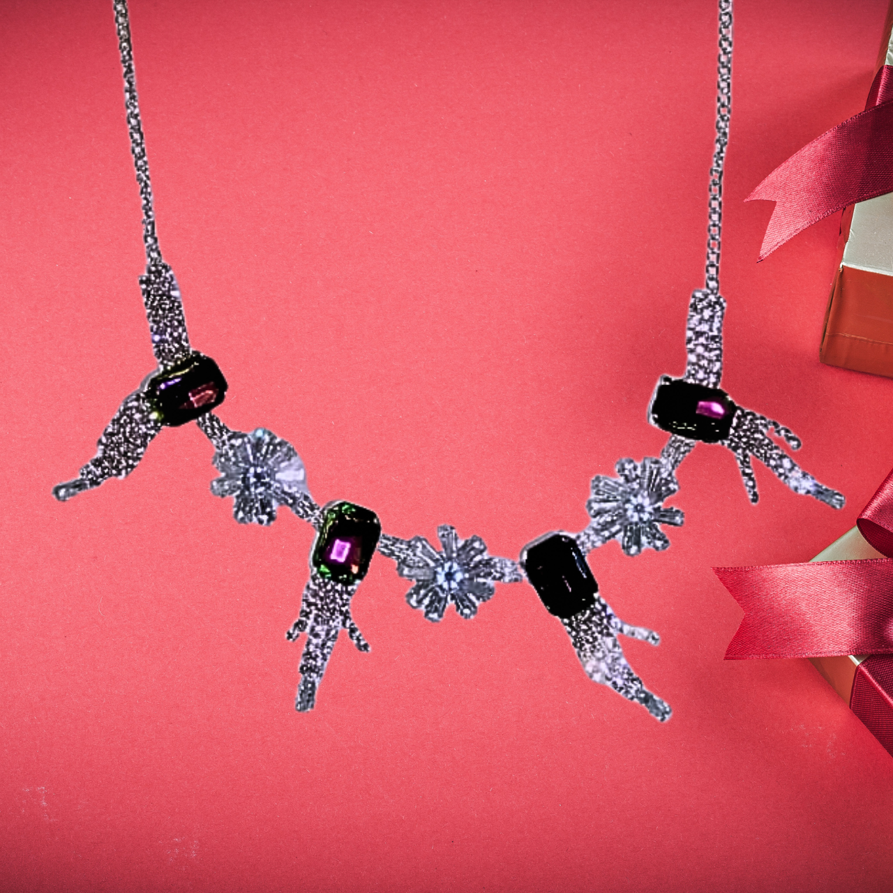 Enhance your jewellery collection with this Designer Stone Floral Necklace, created for women who love statement and artistic jewellery. The necklace features beautifully crafted floral elements adorned with sparkling stones, complemented by striking black stone detailing that adds a luxurious and modern touch.