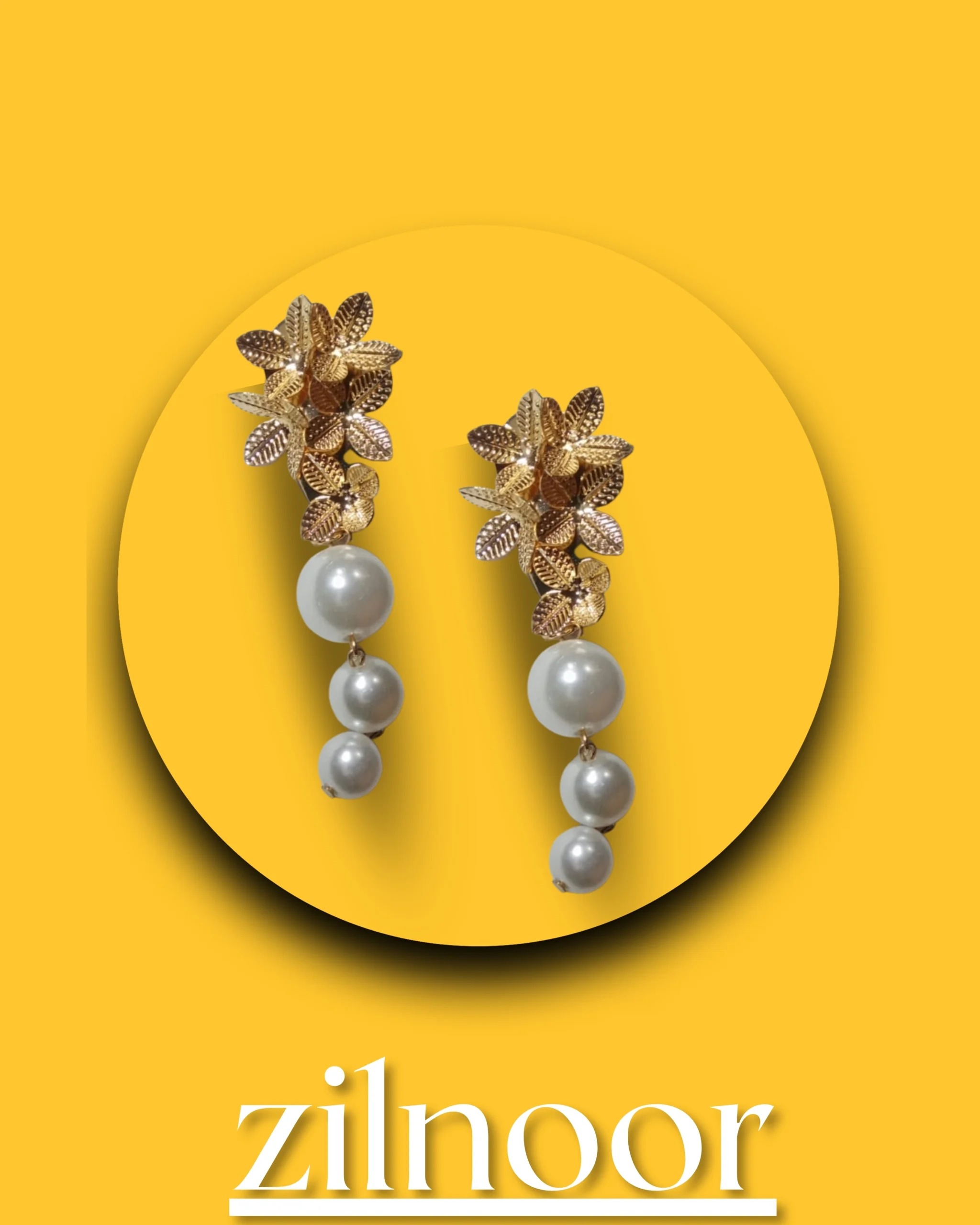dd a touch of royal elegance to your jewellery collection with our Golden Leaf Pearl Drop Earrings from Zilnoor. These earrings are beautifully crafted with intricate gold-tone leaf motifs that flow gracefully into soft, lustrous white pearl drops.