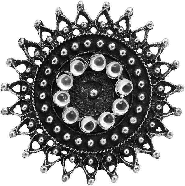 Embrace a distinct style with this stunning oxidized ring. The intentional darkening process creates a beautiful black patina that deeply enhances the intricate details and traditional motifs of the design, giving it a coveted antique, heirloom appeal.