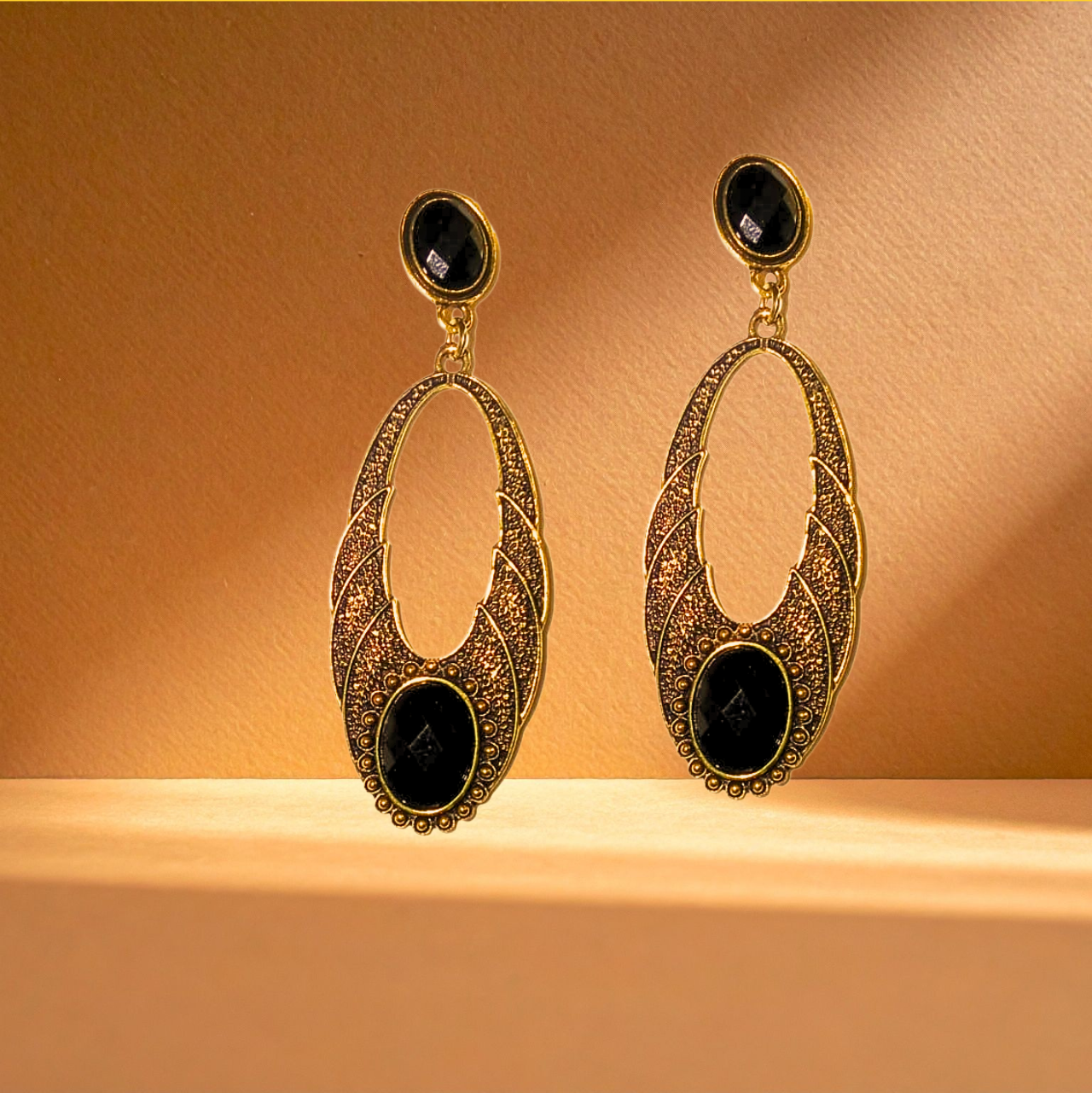 Add timeless elegance to your jewellery collection with our Royal Noir Oval Dangler Earrings. Designed with a striking black stone set in an antique gold-toned frame, these earrings reflect a royal and sophisticated charm.