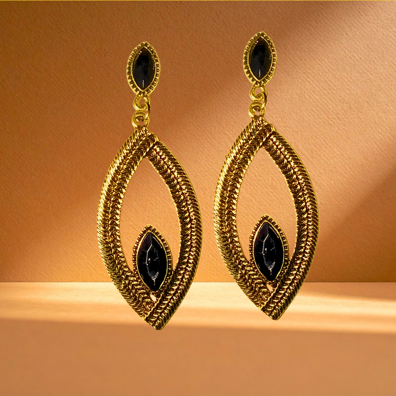 Elegant antique gold-toned dangler earrings featuring a rich black stone and oval cut design, perfect for a royal and classy look.